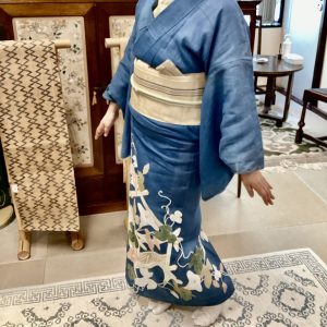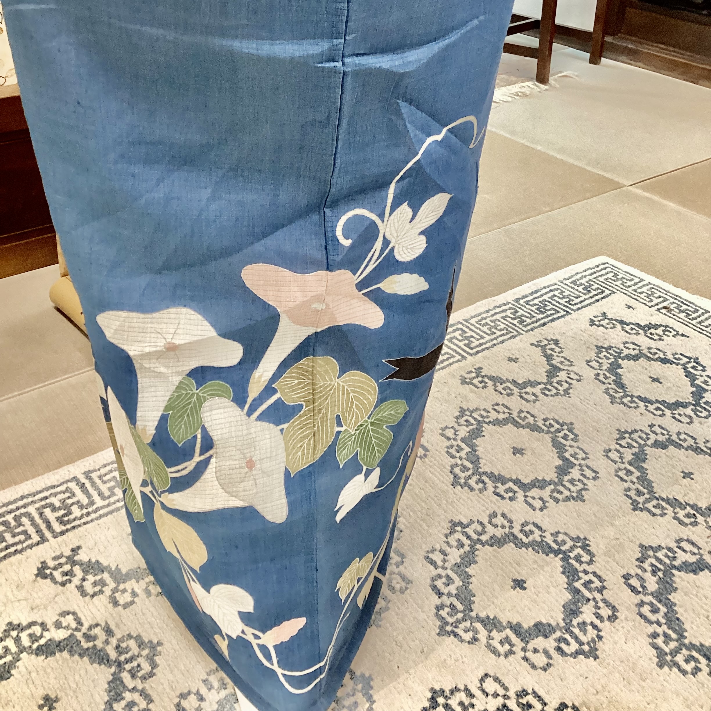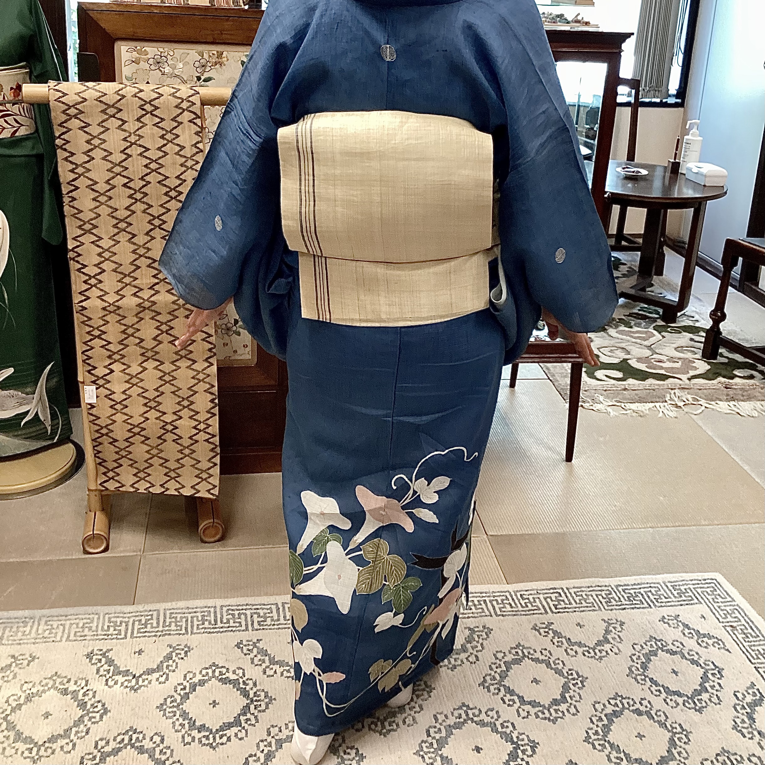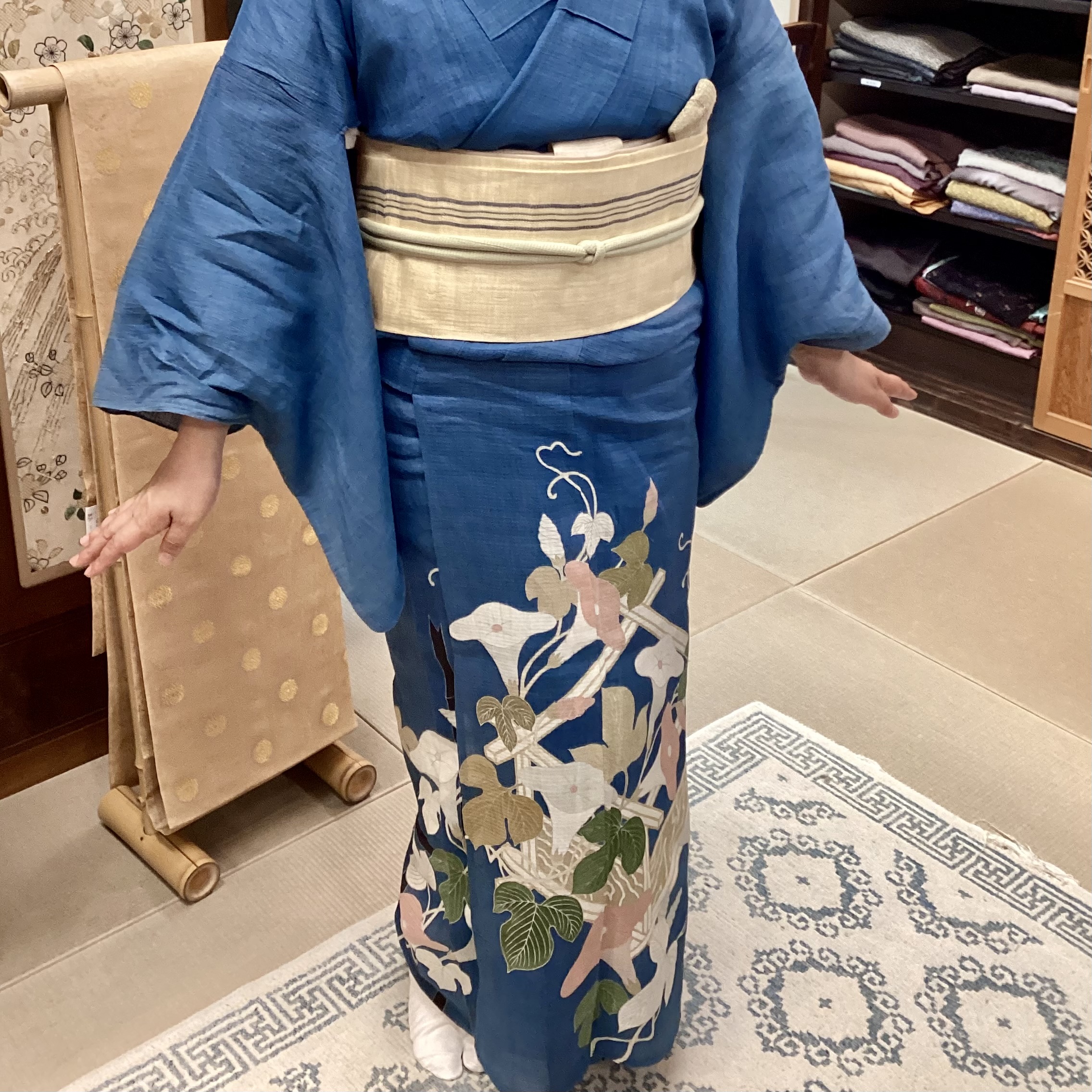 お客様の装い〜小千谷縮の色留袖 灯屋2では8月14日〜16日夏休みをいただきます。お客様にはご不便おかけ致しますが、どうぞよろしくお願い致します。 さて、本日も夏のエレガンスでお越しのお客様のご紹介です。 こちらは小千谷縮で作られた希少な色留袖。古井戸と竹垣に明るい色合いで朝顔がのびのびと描かれています。 地色の藍色も柔らかい色合なので、少しカジュアルにお出かけ着として成立していますね。昔のとても貴重なお着物。 お写真のご協力いただいたお客様、ありがとうございました。 皆様も着物でお出掛け下さい。
