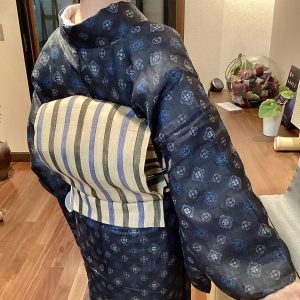 芭蕉布の帯は、明るい藍と黒に近い色合いの藍の太い縞が美しく個性的です。こちらは灯屋2の「琉球展」でご紹介したもので、古い琉装の着物から作りました。