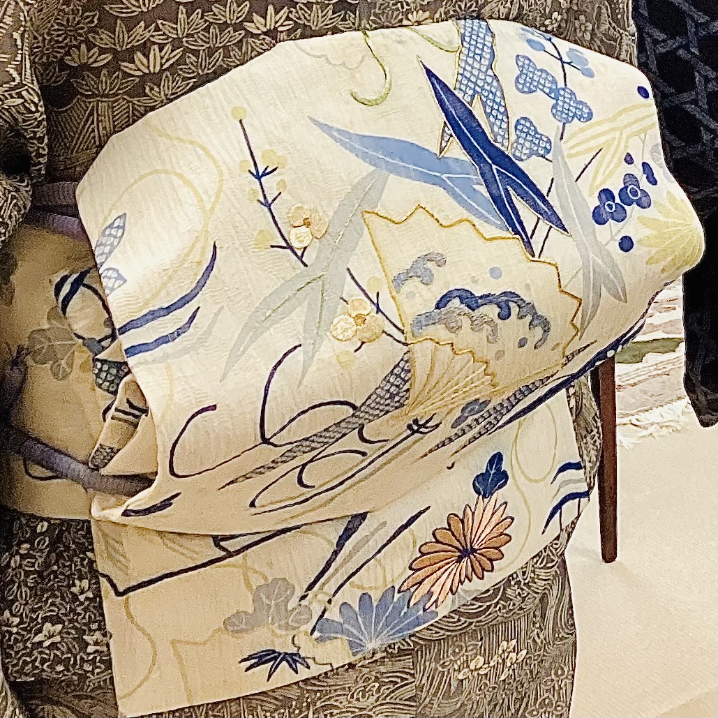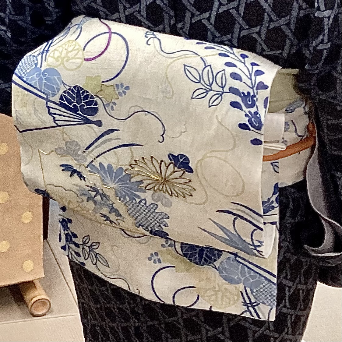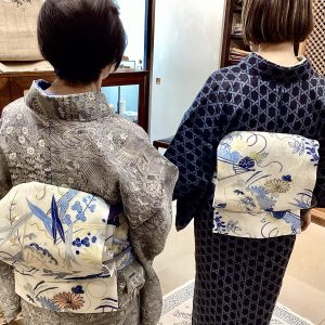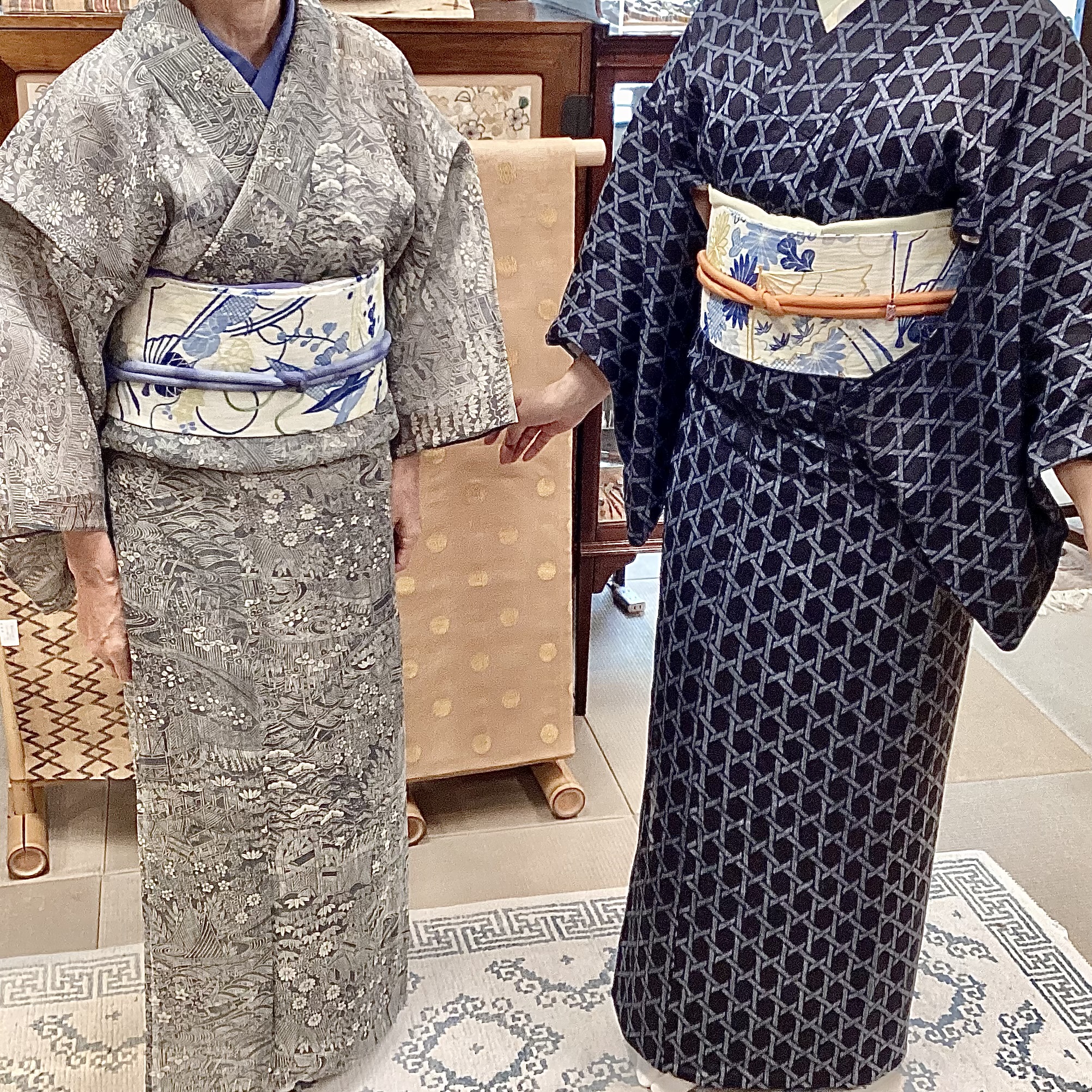 左側のお客様は古典柄の小紋に、右側のお客様は籠目柄の宮古上布に合わせて、全く違った印象に!