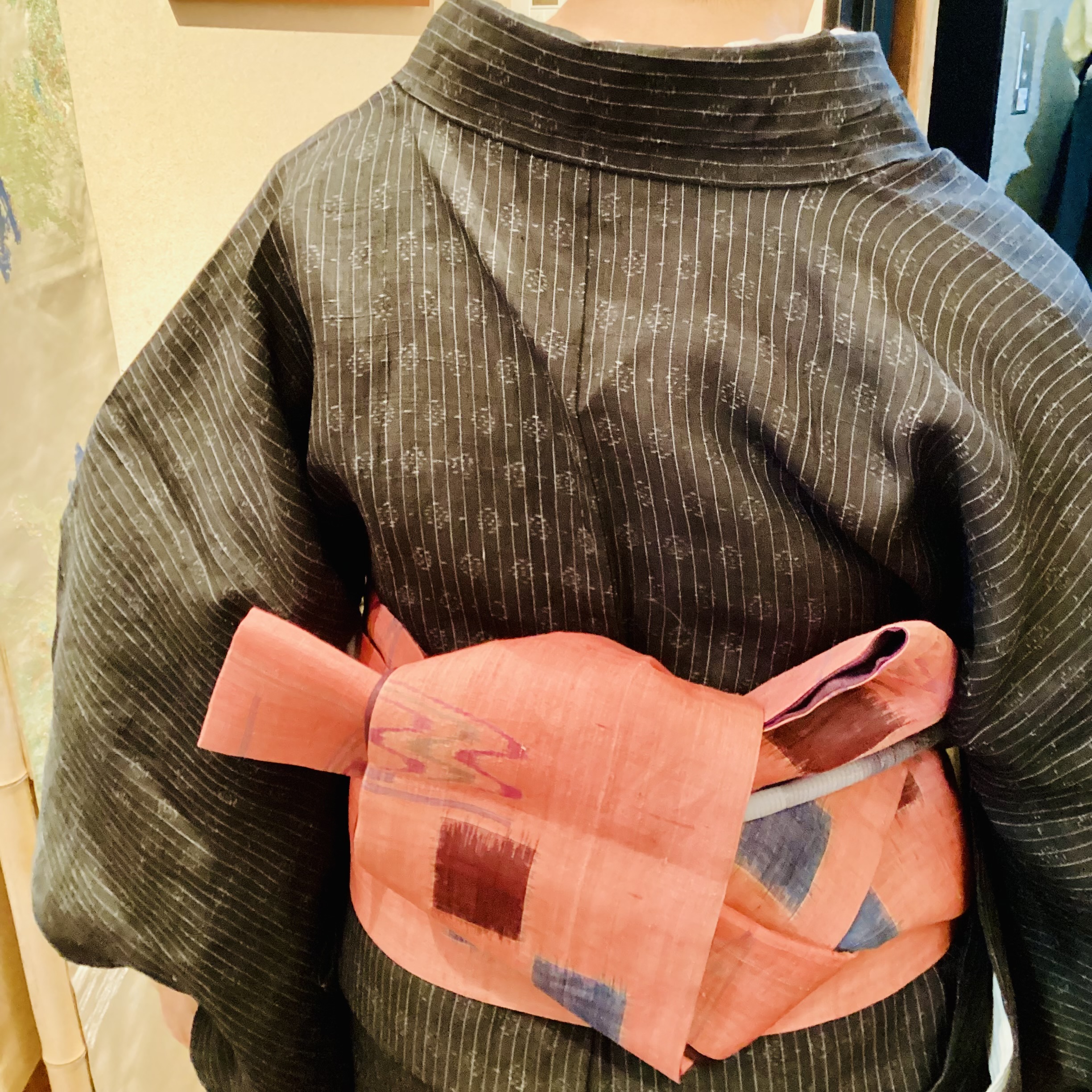 こちらの帯は灯屋2「琉球展」でご紹介した半幅帯です。古い琉装仕立ての首里上布の着物から作りました。
