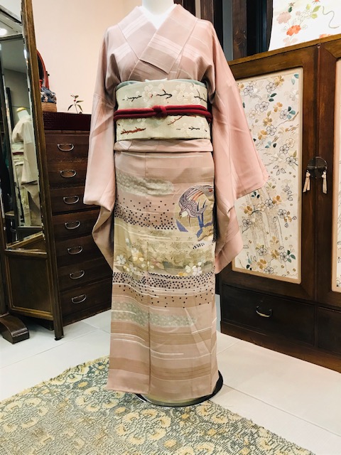 こちらの付下げは淡い灰桜の地に横段が織り出され、よく見ると織と染で薄紅や水色といった鮮やかな横線が入っており上品な中に春の陽気のような華やかさが潜んでいます。