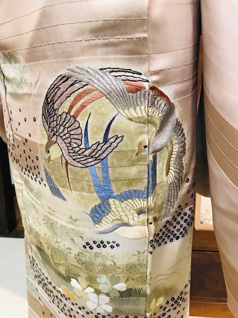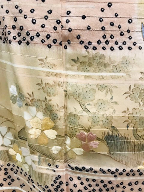 上前には素晴らしい刺繍で尾長鳥が輪になって戯れ、手書きの桜はそれは繊細な筆遣いで描かれています。