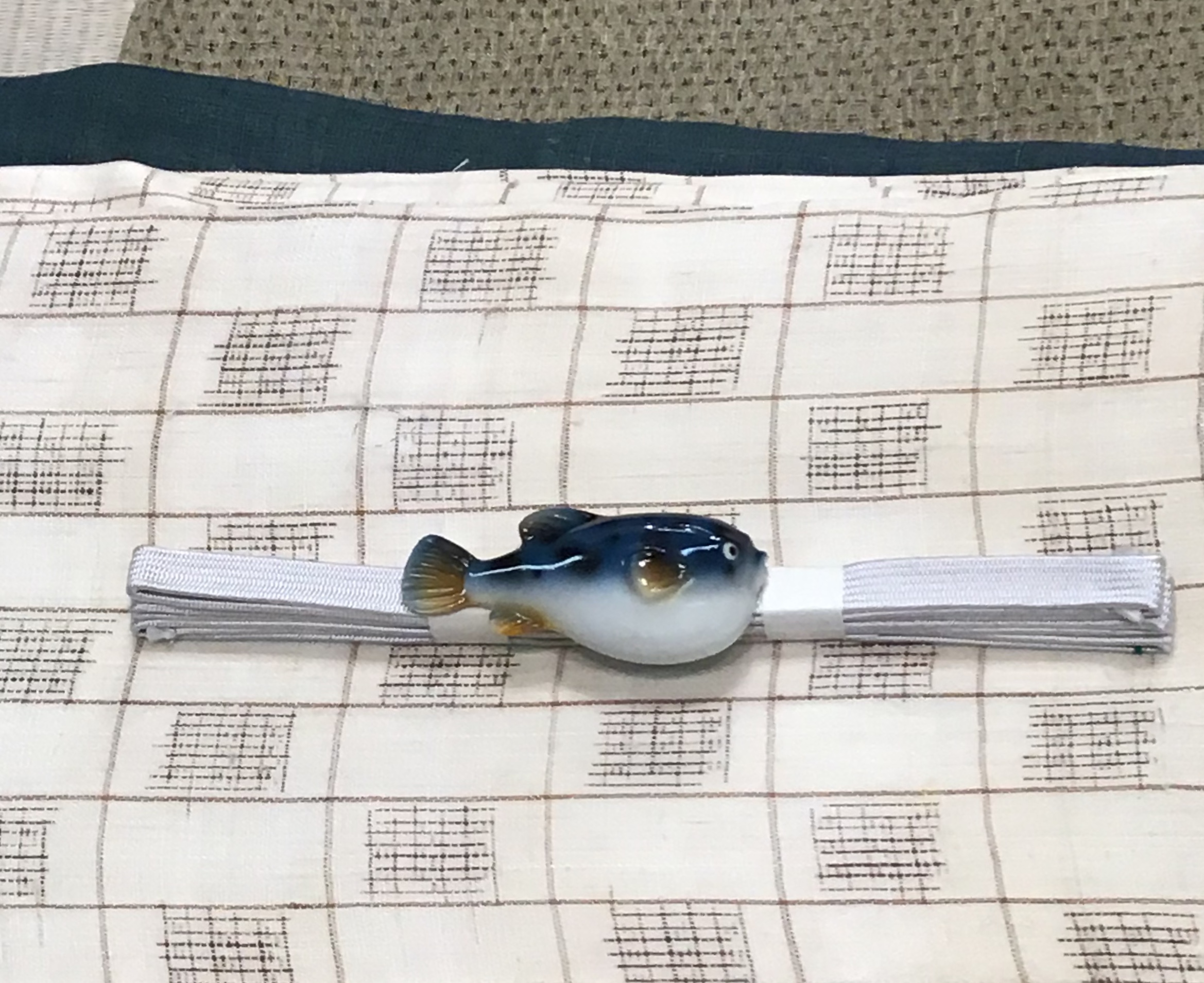 海晒しされた帯に泳ぐのは、ぽってり可愛いフグの帯留め。