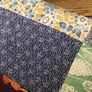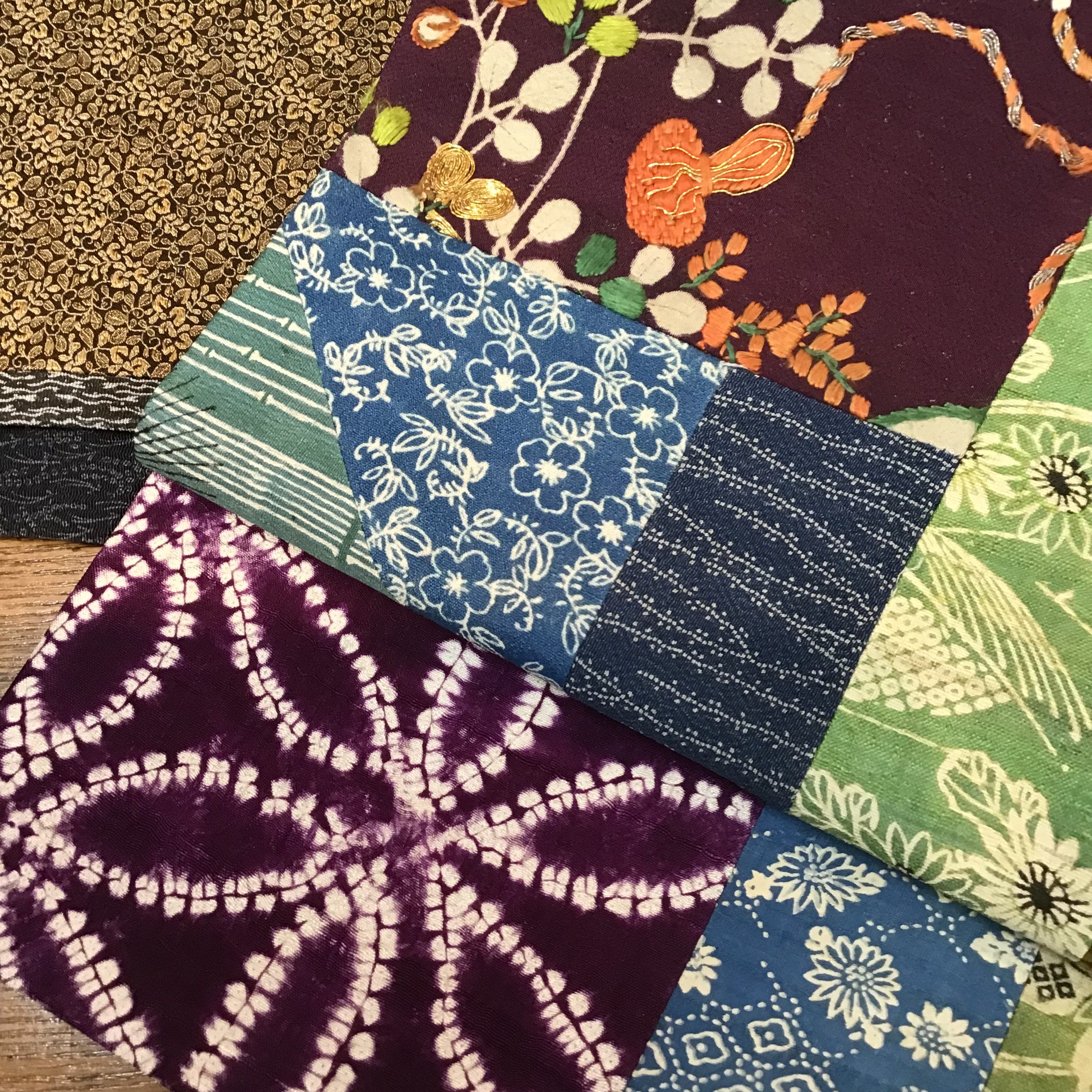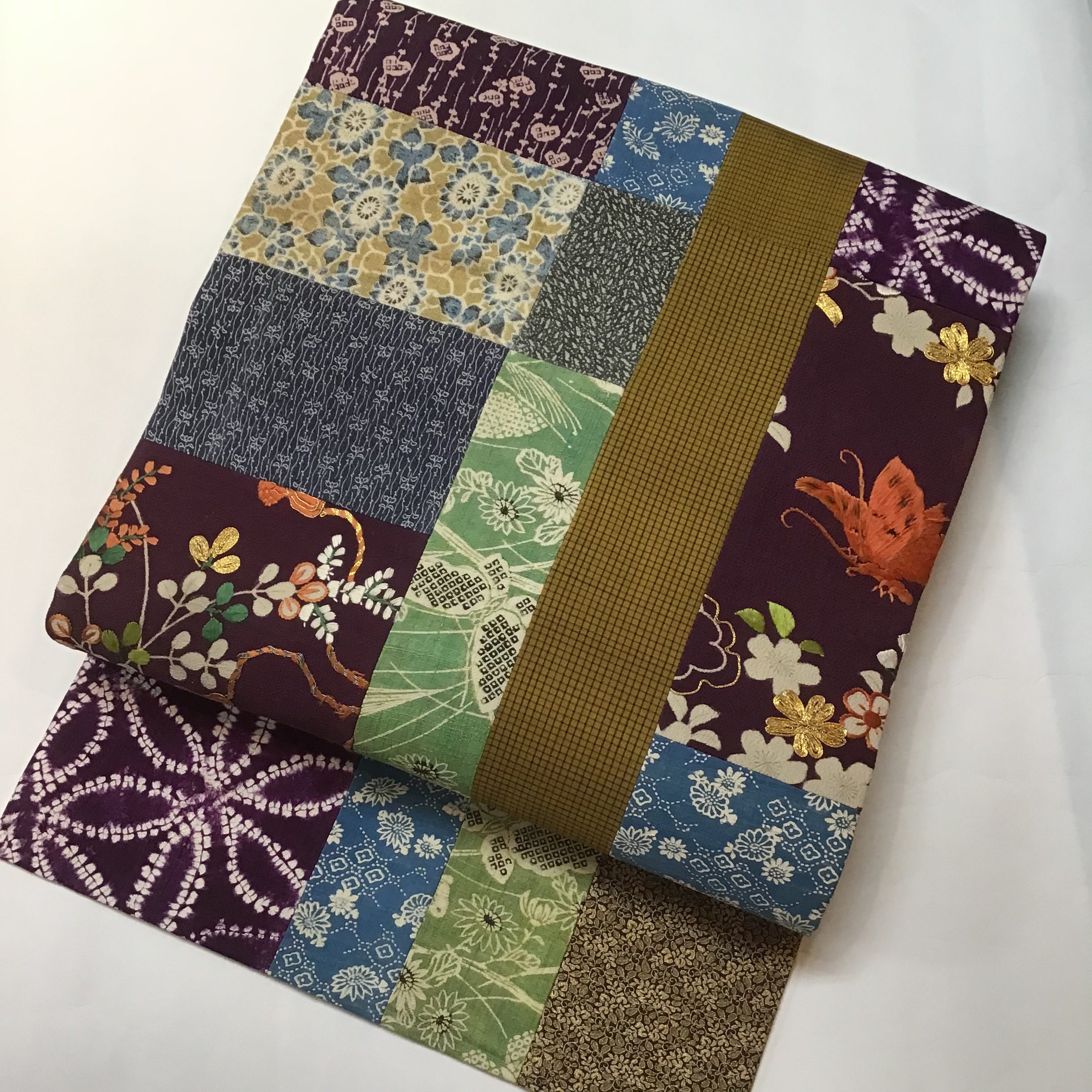 江戸裂をはじめ紫根染、黄八丈、和更紗、江戸小紋など様々な技法を用いた古い貴重な裂を大胆にそして繊細に継いでいます。