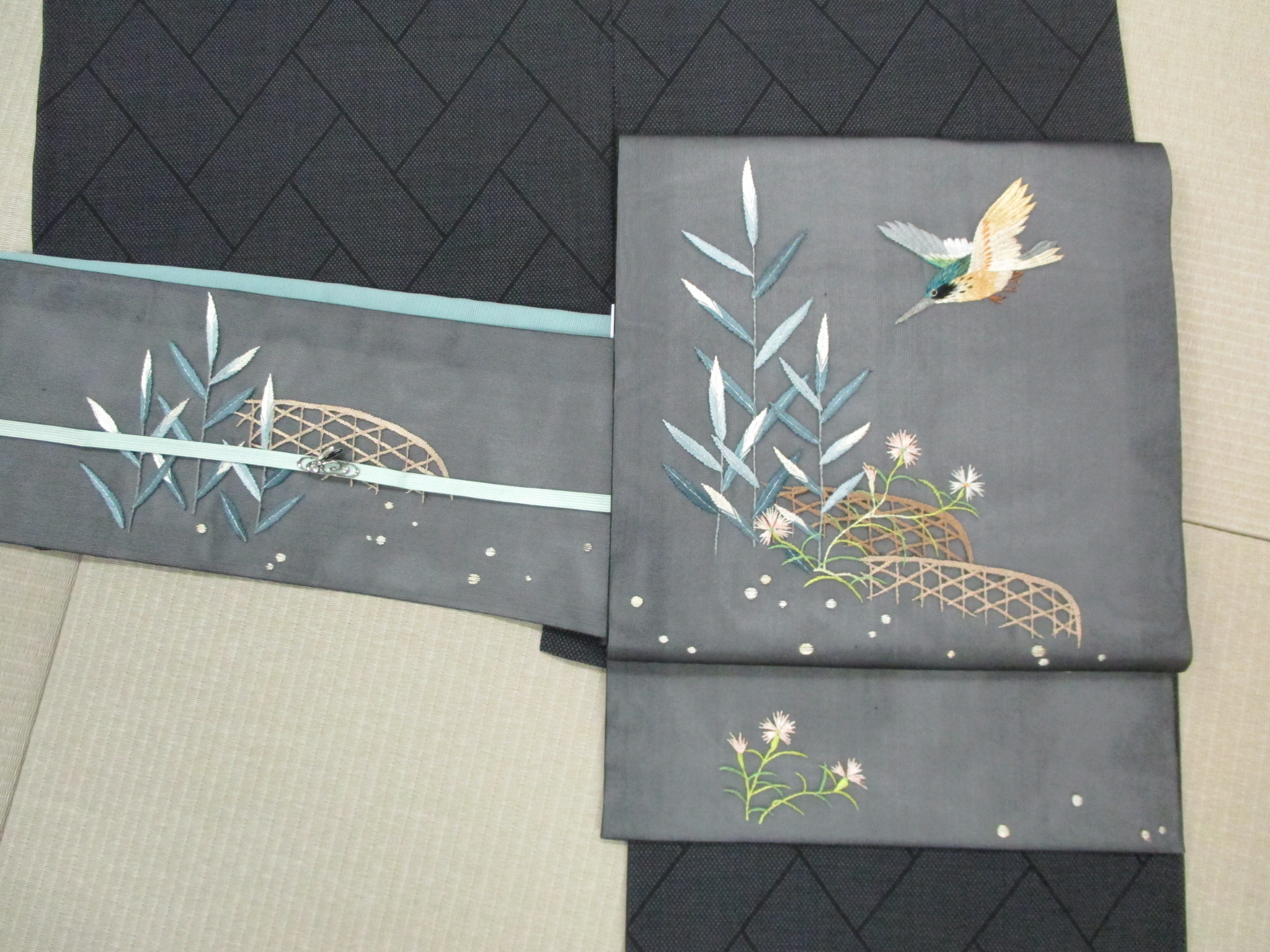 今日ご紹介の帯は、黒の紗帯に、カワセミや葦の模様が美しい刺繍で表現されたもの。水面に何か美味しいものでも見つけたのでしょうか?美しい羽根を広げて、飛んでくる情景が何とも躍動感にあふれています。