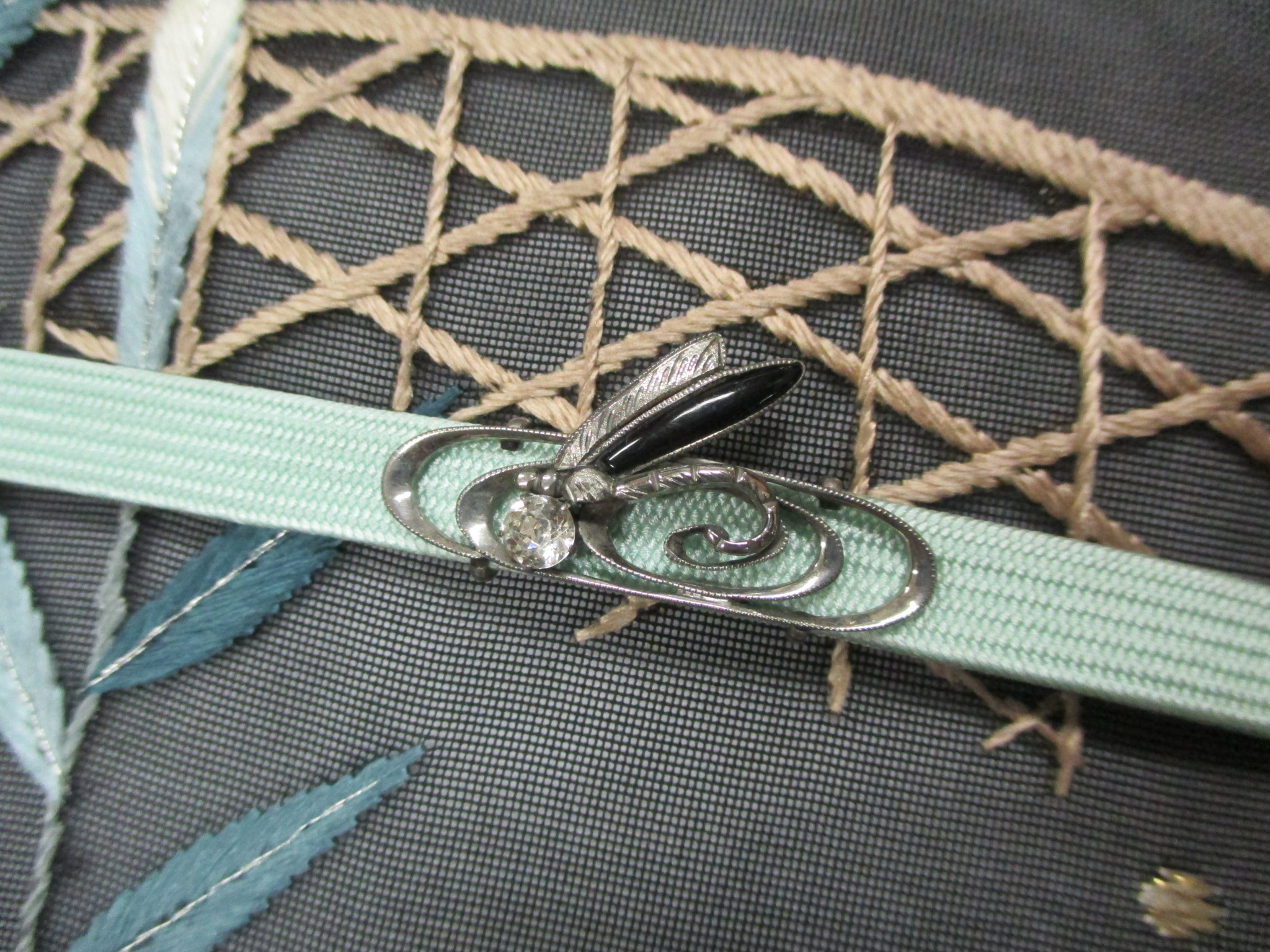 帯留も、水面に留まる蜻蛉の姿を表したもの。黒い練り物の羽根、一粒のガラスが水滴のように見えます。