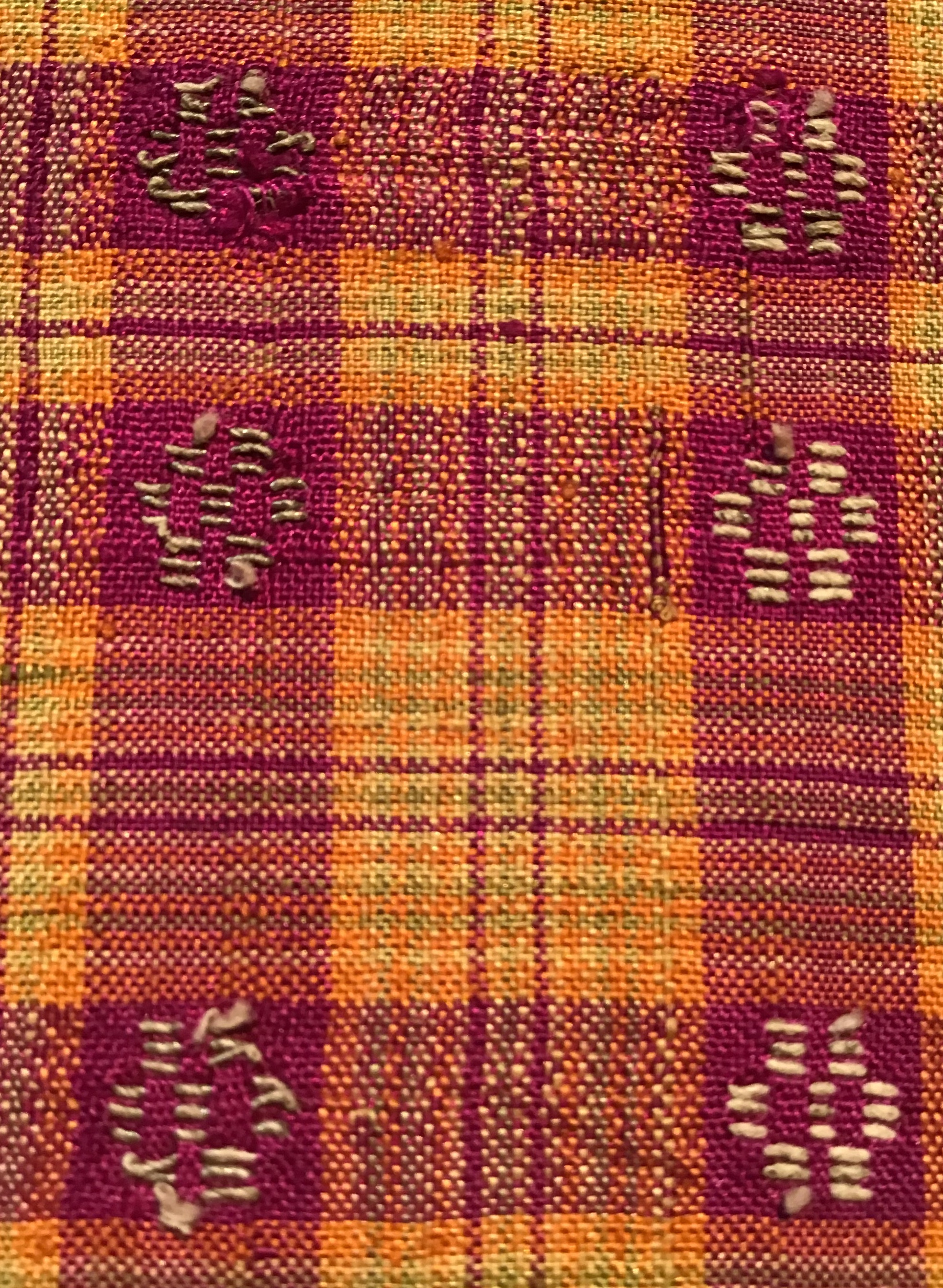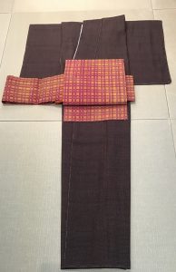 格子の可愛いこちらの帯は花織のルーツ、インドネシアの布を名古屋帯にしました。