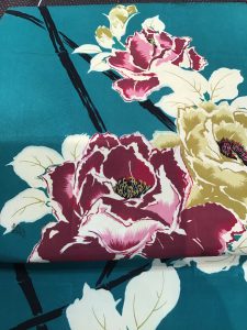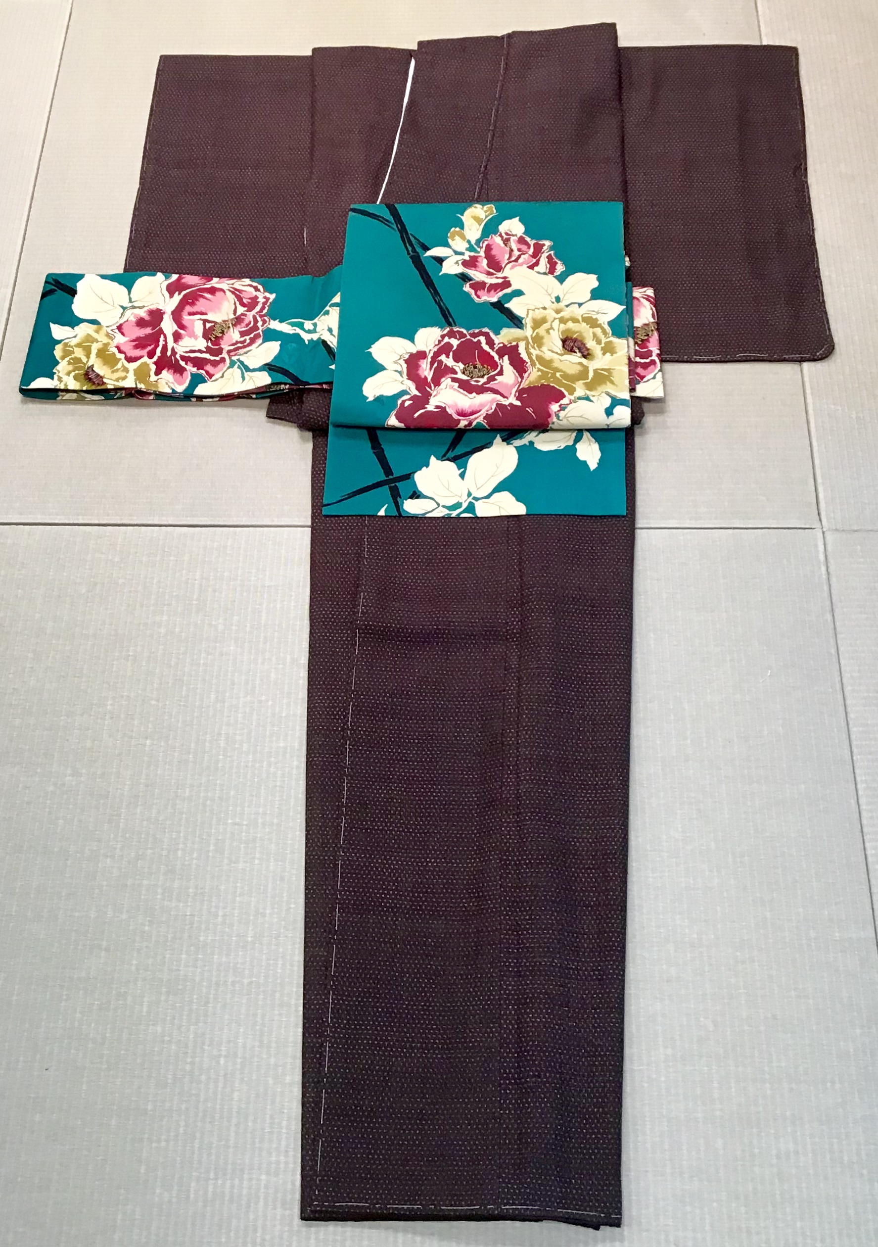 大胆な青緑の地に籬にぼたんがあしらわれた帯は、もともとは型染めの着物でした。