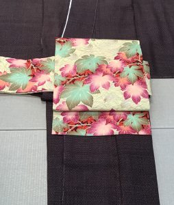 優しい色味中にある赤に黒縁のヤツデが帯全体をピリッと引き締めます。