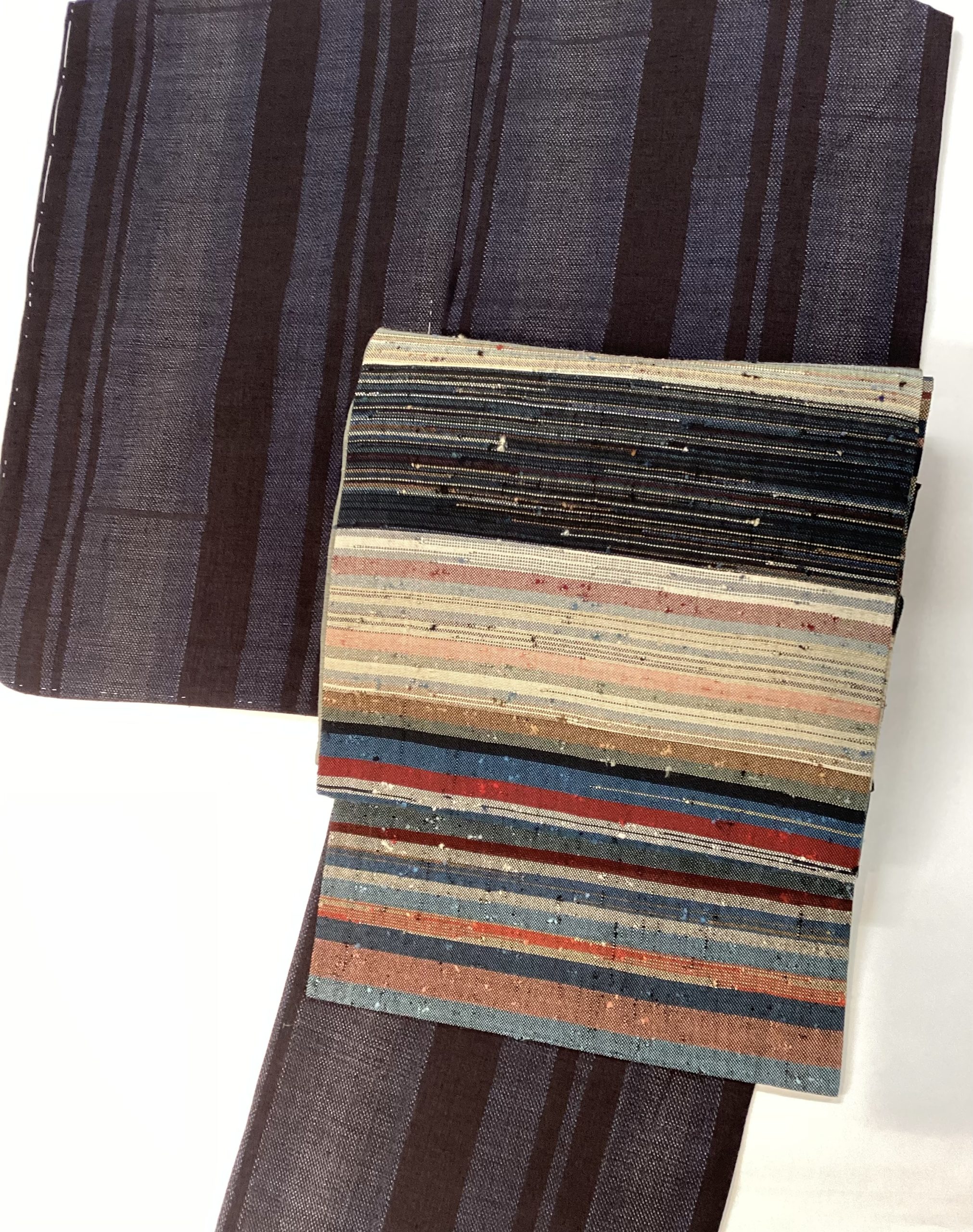 着物は太い糸から手織りされた、しっかり、しなやかで、あたたかく、シワになりにくく、冬でも単衣でお召しいただけます。