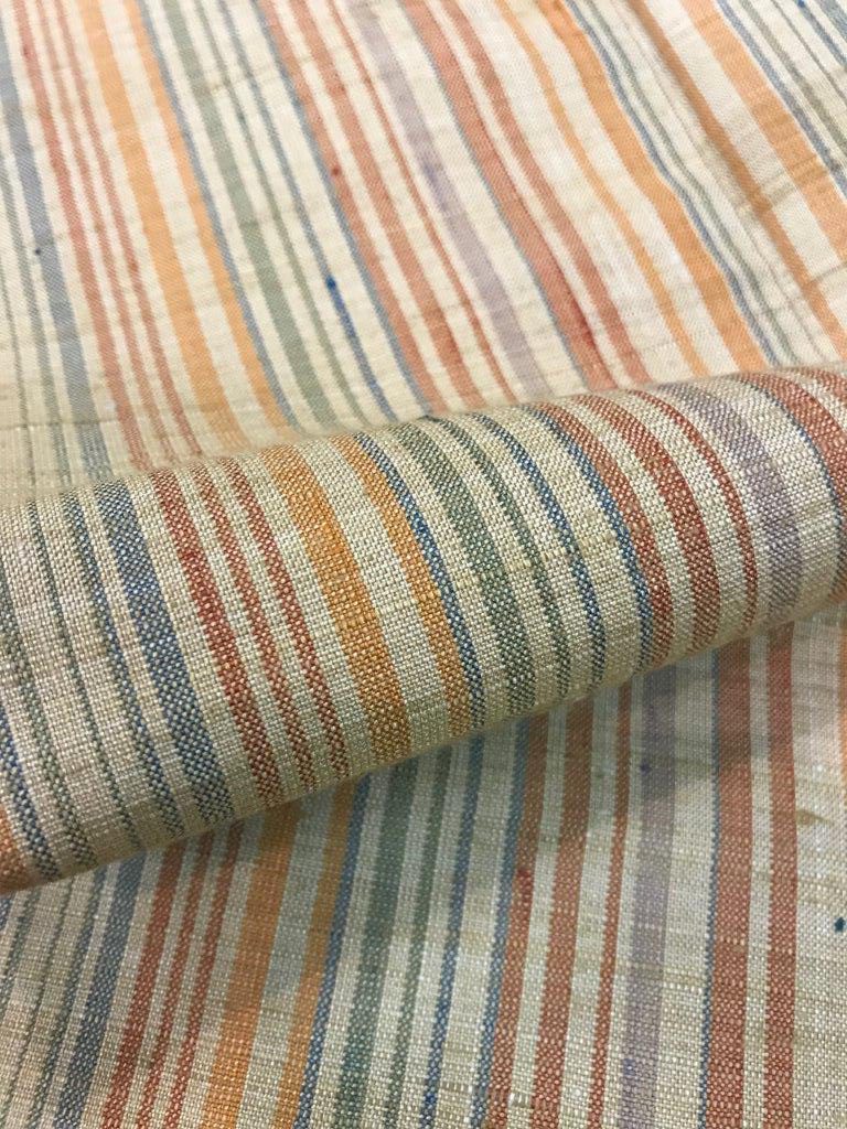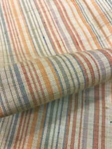 生成りの地色に経糸で抹茶色、納戸色、琥珀色、藤色の縞が並びます。