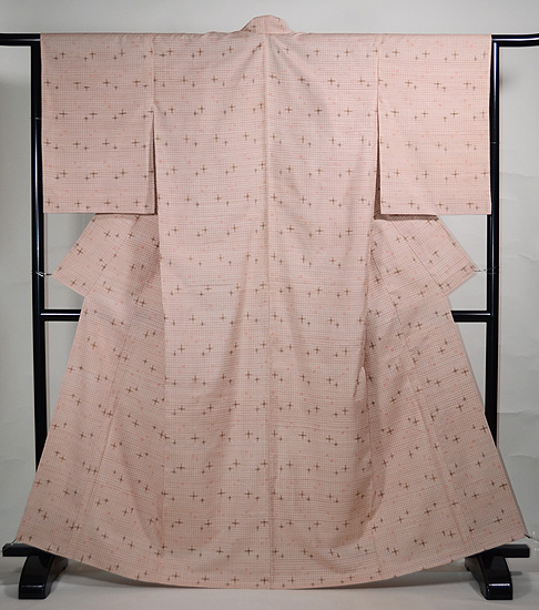 優しい色の替わり格子の中に花十字が浮かんでいて、その中に、井桁絣が子供のように守られるかのように入っています。