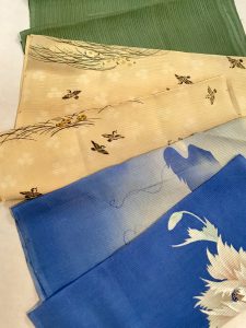 この色合いは、昔の配色ですが、今ではかえってモダンに感じます。最近の小千谷ではなかなかお目にかかれない図柄です。灯屋2では、こちらのお着物をお仕立て手直してご用意しています。