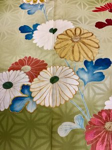 HPでも紹介されている麻の葉紋に菊枝の訪問着は、地紋に麻の葉が織りだされ、鮮やかな菊の花と枝葉がいきいきと描かれ、随所に刺繍、駒留、金銀の色がさされて華やかな仕上がりです。