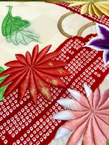 帯はひし形に織り出された地に大輪の菊が刺繍され、朱の疋田絞りで筏が染められています。