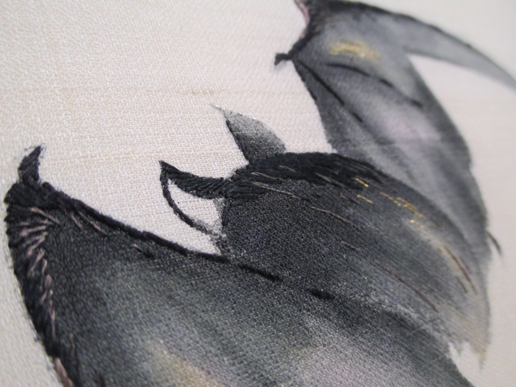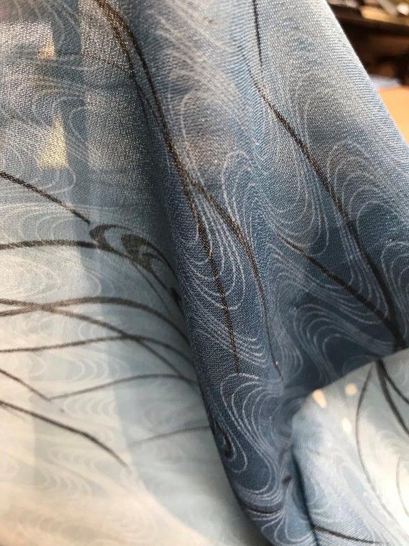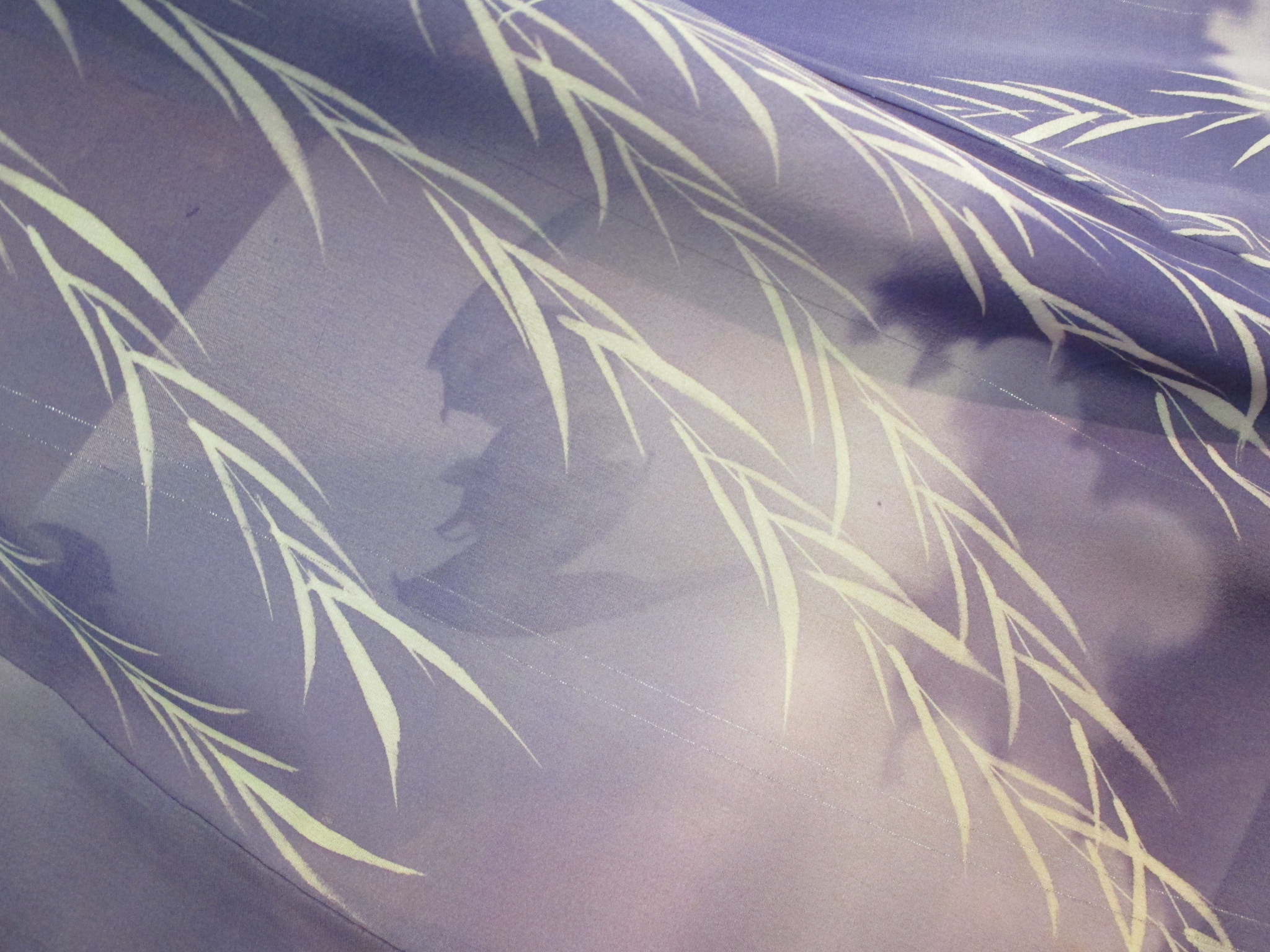 透けるような布地に霞みが染められて、しだれ柳が描かれています。