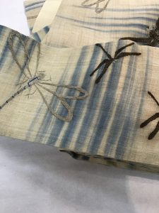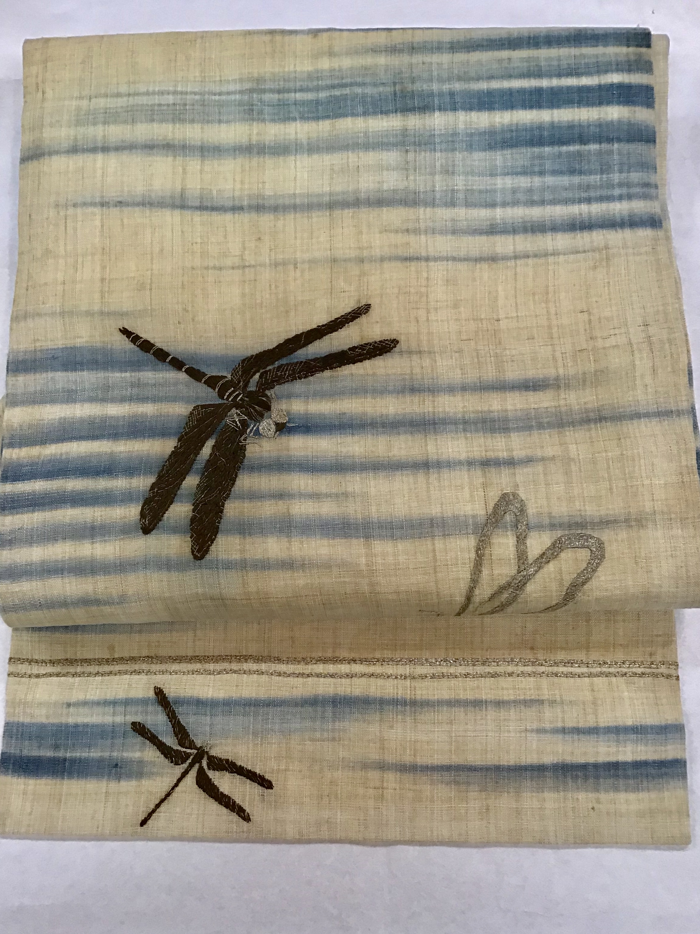 銀と茶の刺繍のとんぼが飛んでいます。
