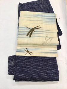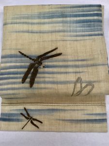 合わせた帯は、生成りの地色に藍で表現した水辺でしょうか。