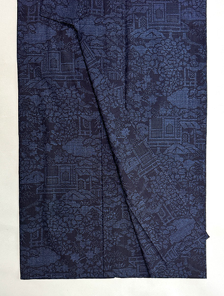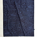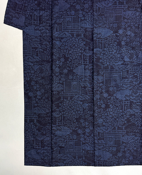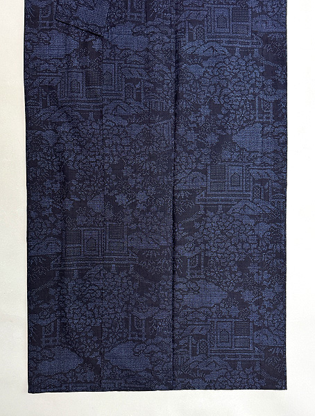 寺社や鳥居、植物などの柄を100亀甲で全体に織り込んだ深い色合いの本場結城紬。