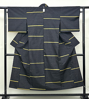 十字絣を織り込んだ生成りと芝翫茶を交互に織った粋な横段の単衣。
