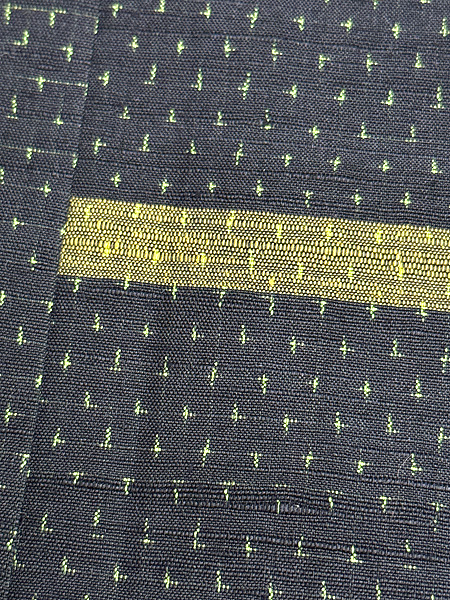 黒地に草色の蚊絣の紬は、ところどころに入った十草色の横筋でモダンな印象に。