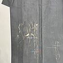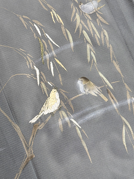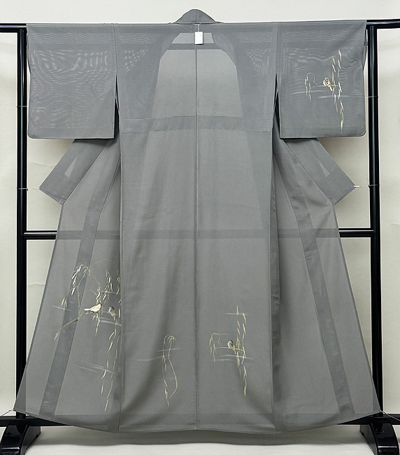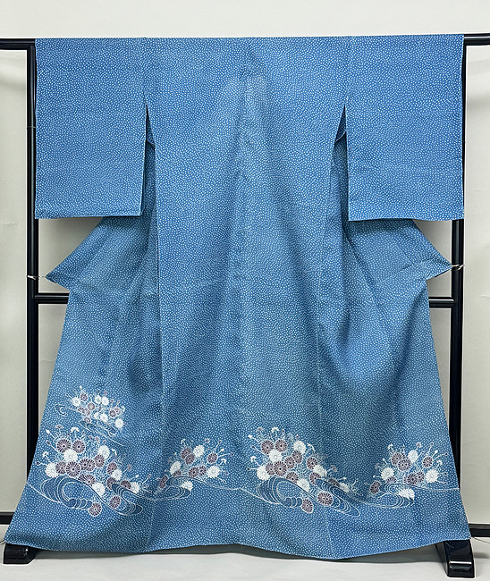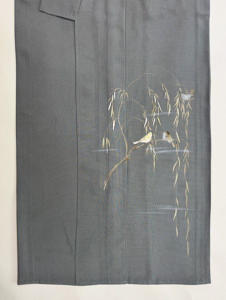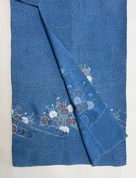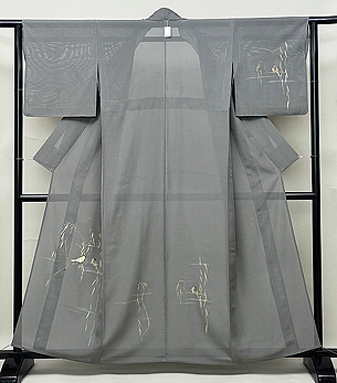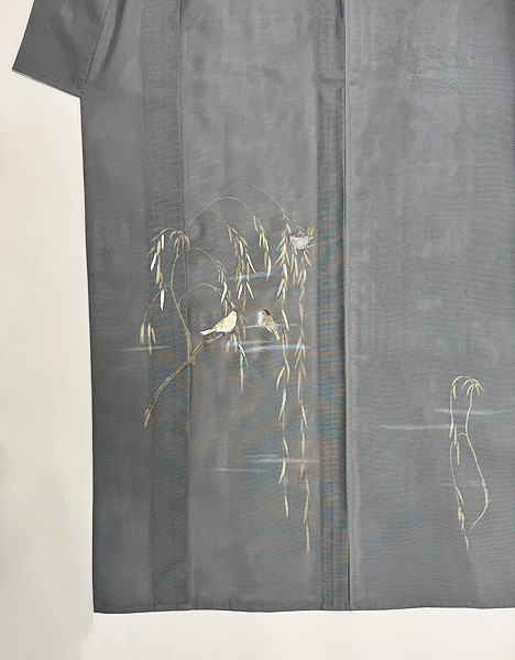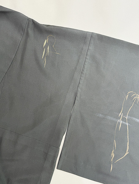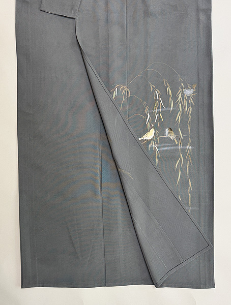 桔梗鼠色の縮緬はしっとりとした手触り。裾に大胆な光琳水が友禅染めされています。