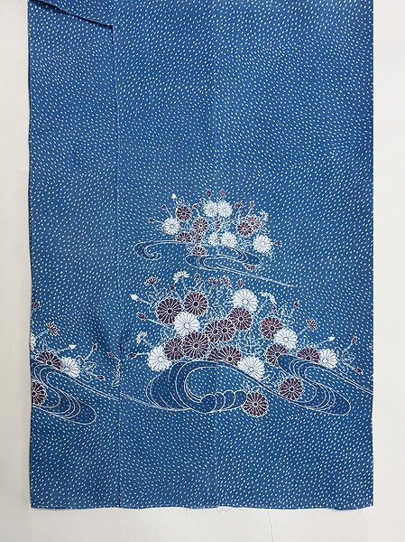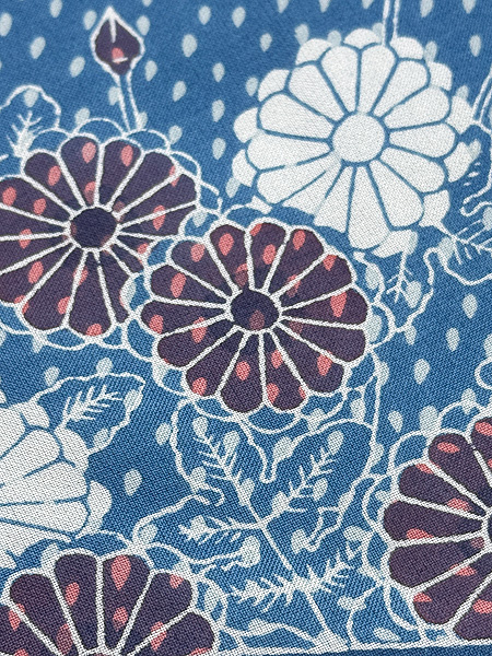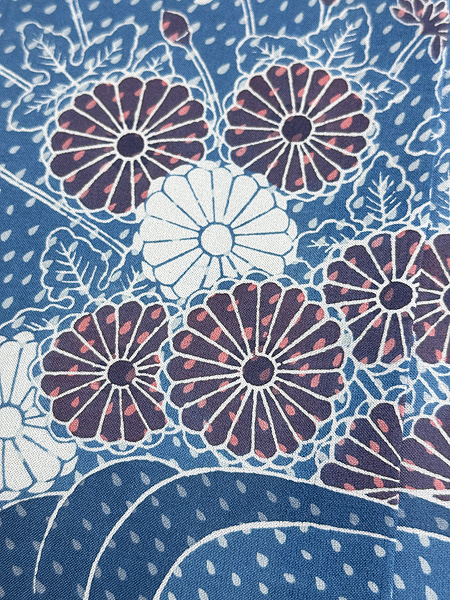 型を置いて糊伏せしたあとに捺染したのでしょうか、グラデーションのある色合いが味わい深く、ダイナミクな柄ながらも上品な印象です。