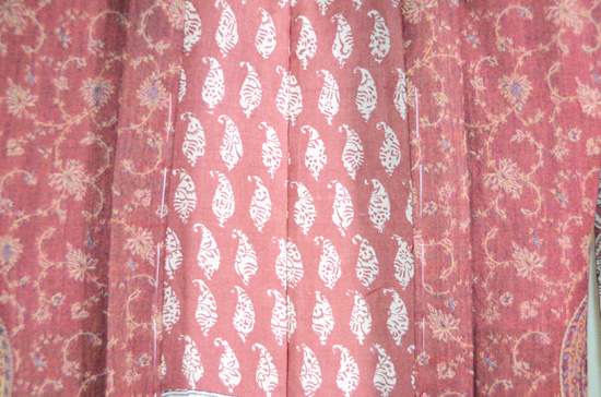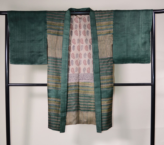 表地の深緑も珍しい色ですが、また、八掛がとても可愛い桃色の縮緬小紋です。