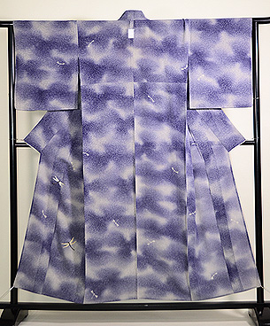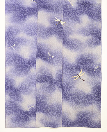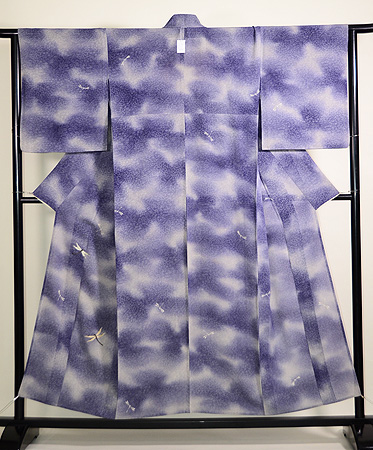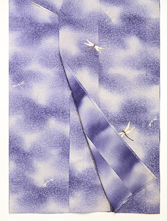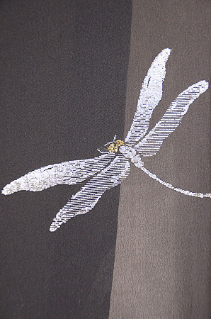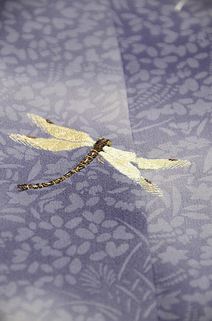 着物一面を萩の透かし模様が覆い、大きなトンボが自在に飛んでいます。