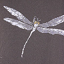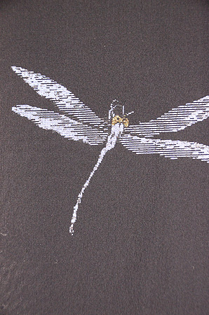 エンドウの花と黒いシルエットの蜻蛉が無線友禅で描かれています。