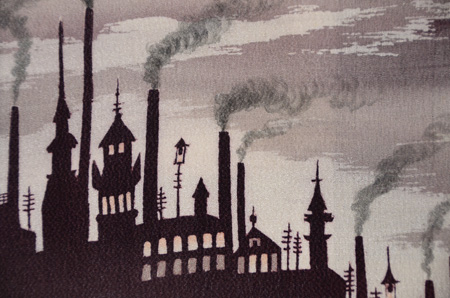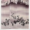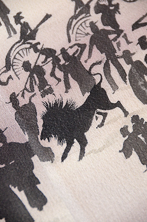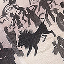 墨黒の地色に烏と鷺とが織り出されています。