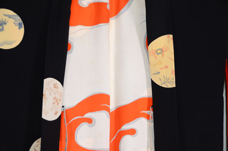 裾返しに犬箱などおもちゃ尽くしも垣間見え、王朝文様がきらびやかに展開されています。