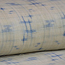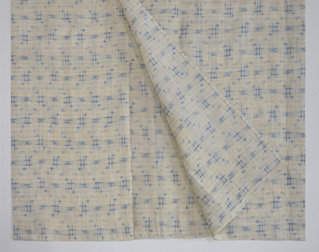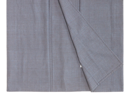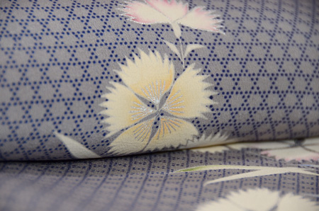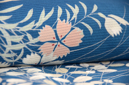 藍色の地に浅縹色の不規則な細かい横段が織られている錦紗縮で、シワになりにくくシャリ感のある着心地が気持ち良いです。
