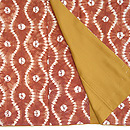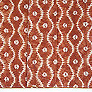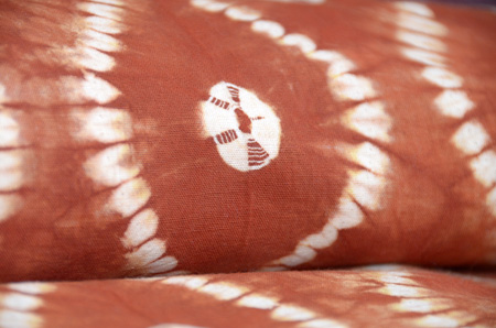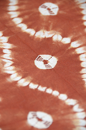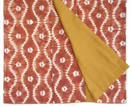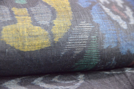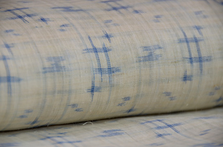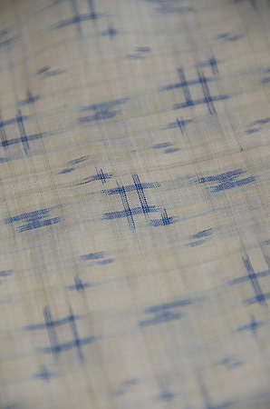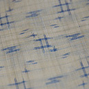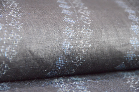 深い藍、縦縞の中に、福木の茶と車輪梅の赤が緯に走り、緯浮花織となっています。