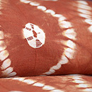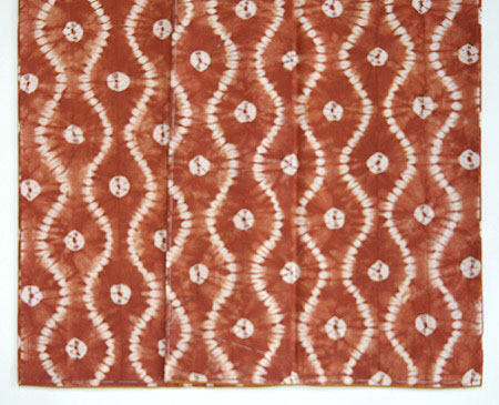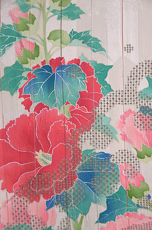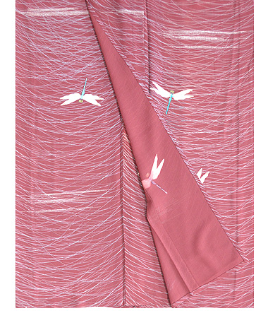 大胆な流水文様が夏にぴったり。糸目糊の上にさらに珊瑚色の染料で細い線を置いてあり、その一色が効いています。