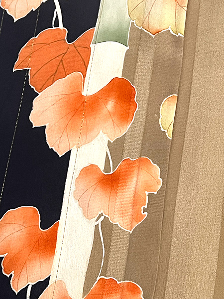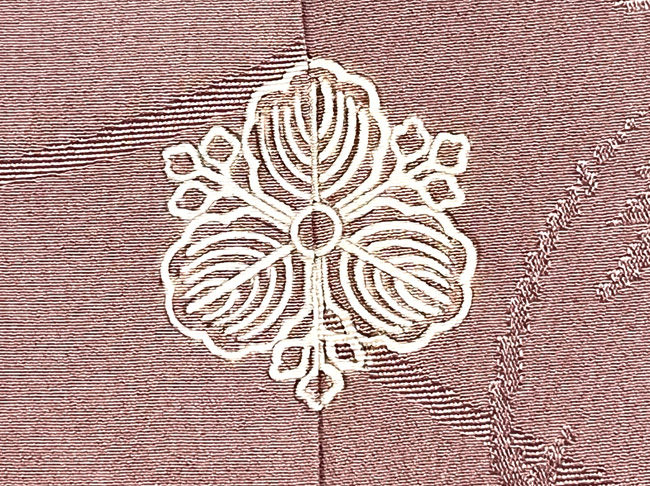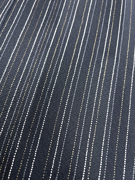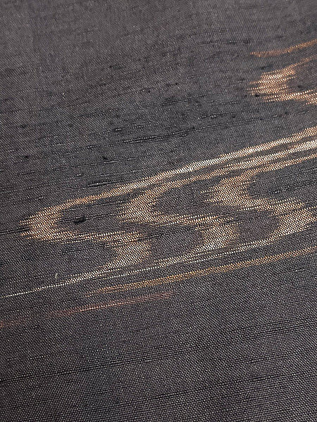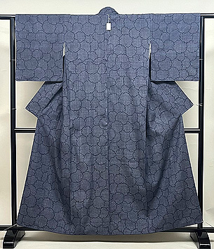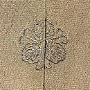 錦紗に紬糸が横に入って、絽に見える単衣の薄物で、黒田藤巴という黒田藩の家紋が大きく5つ染め抜かれています。