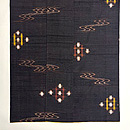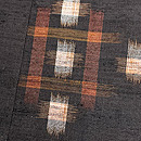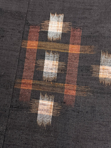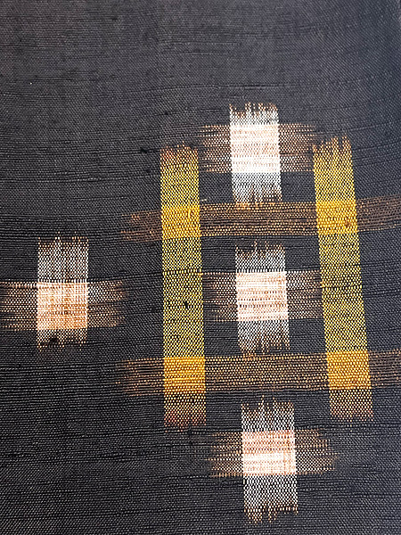 明るい茶に藍が入る十字絣と、焦茶の角は太陽と月でしょうか、バランスの良い幾何学紋が織り込まれています。