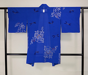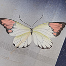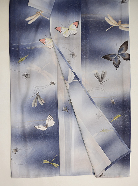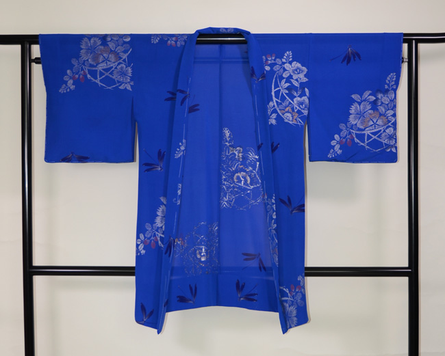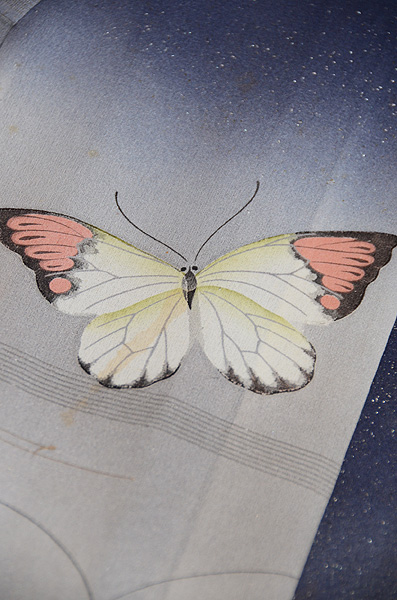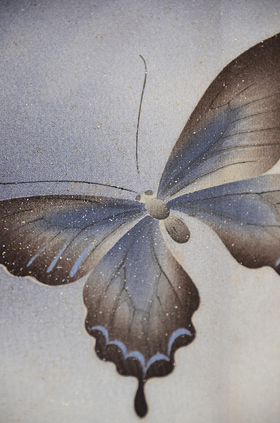 大きな蝶々に合わせて、観世水の大きな文様が銀糸で織り込まれた、昭和初期の羽織です。