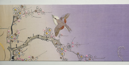 非常に渋い丸帯をみつけ、華やかな梅の着物に合わせたら素晴らしかろうと、武士階級のウグイスを刺してみました。