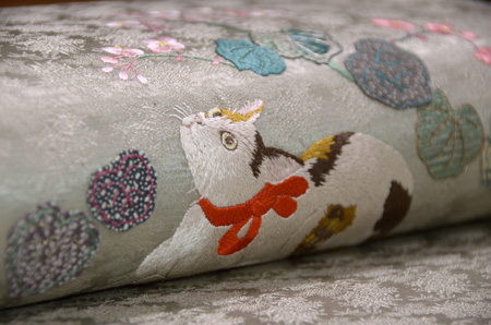 鵜の表情がユーモラスな、オリジナル刺繍の帯です。