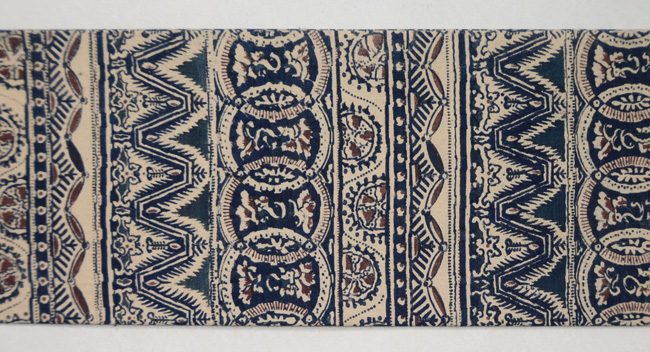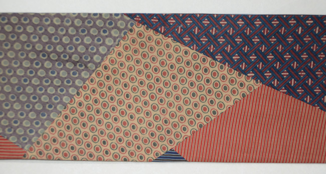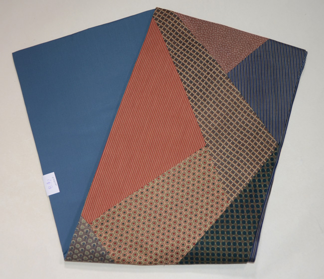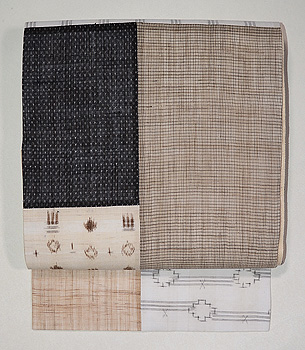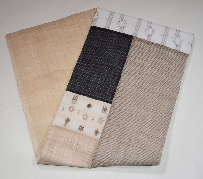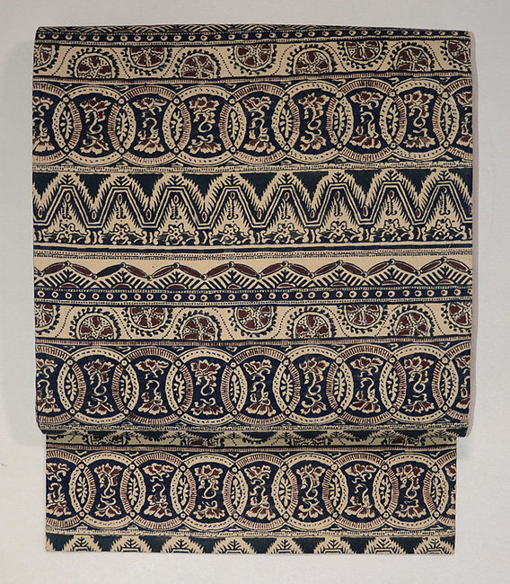 渋いけれどもやさしい色調の和更紗を合わせて型紙に取り、名古屋帯にしました。