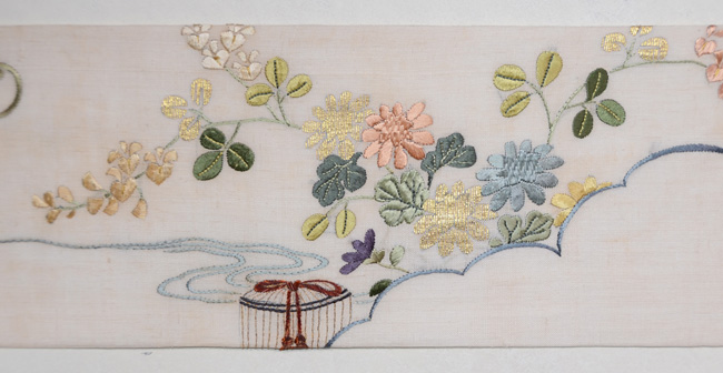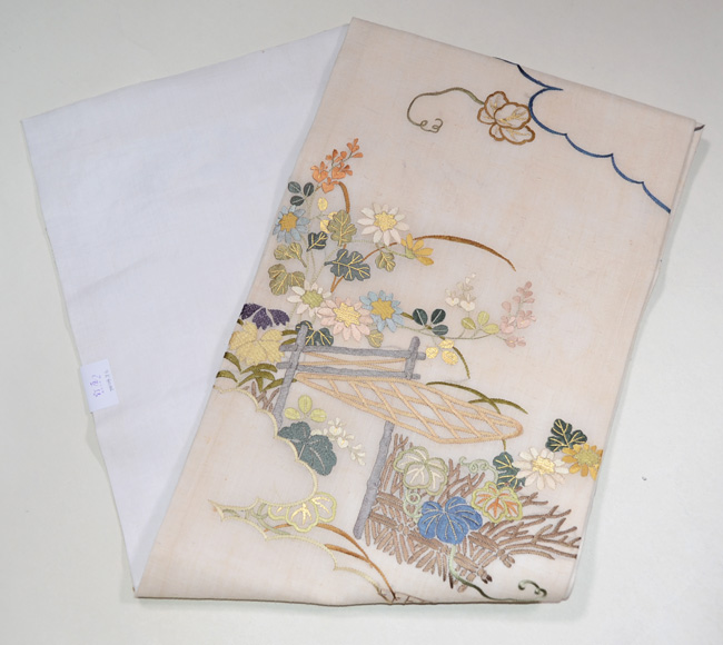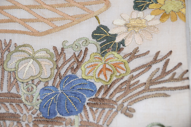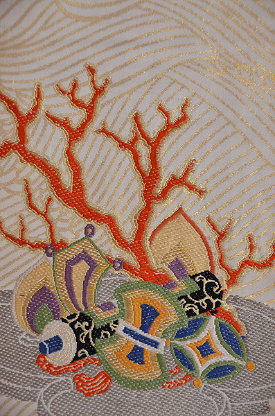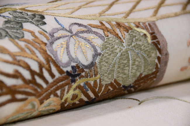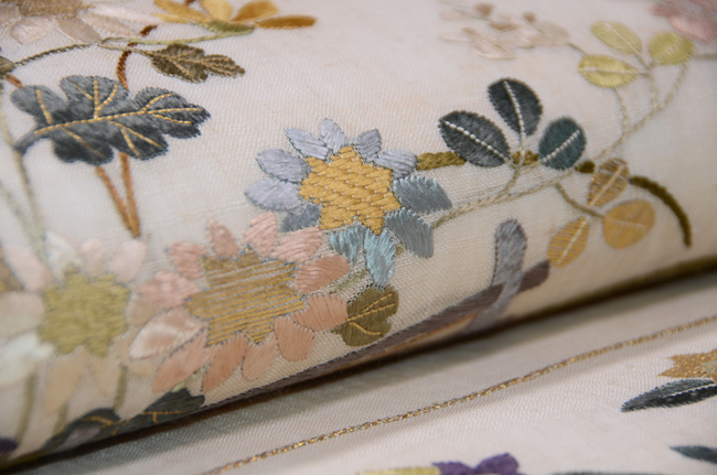白揚げの可憐な桜に松と、シンプルな中に、朱と緑の刺繍が絶妙なバランスを保ち輝いています。