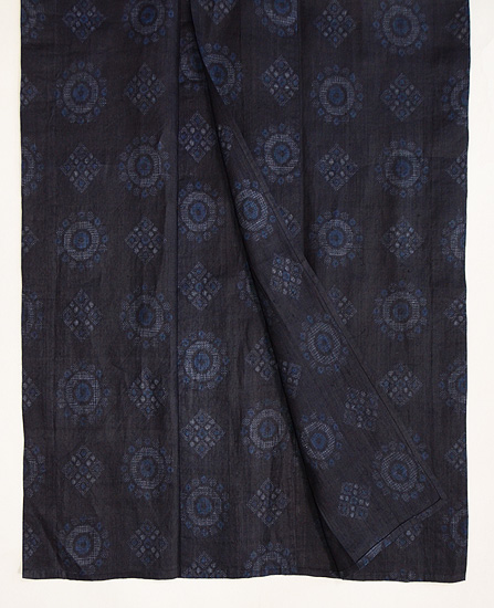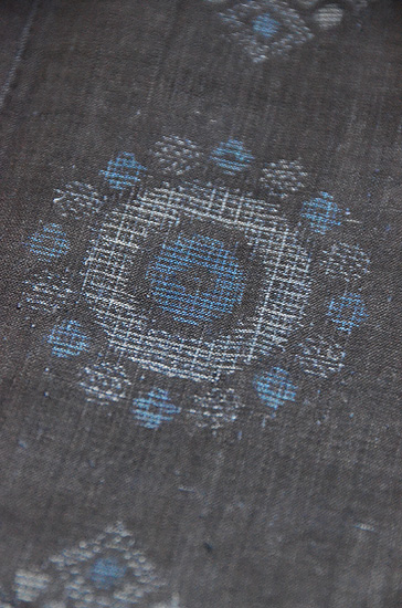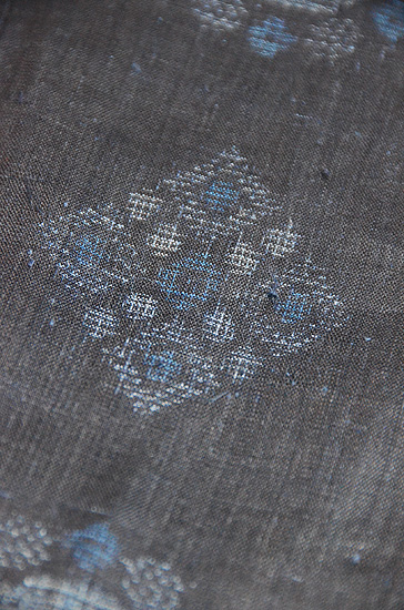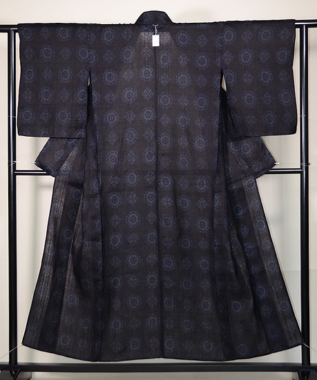 丸紋や菱紋がお行儀良く並んで、絣の白と薄藍の糸が愛らしく織り込まれています。 とても品格があり、、凛々しさも備えて、南の産としては、作り手の性根が偲ばれます。 まだ入手したばかりで、お手入れ前ですが、お仕立て直しで大きくなります。