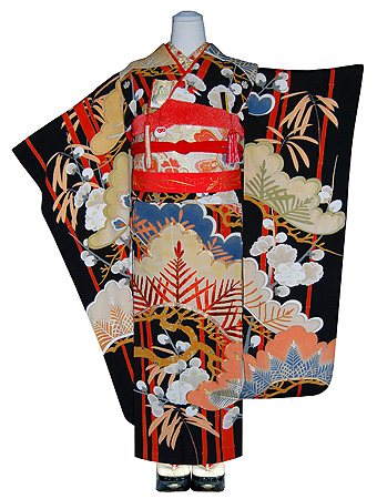 墨色と朱色と浅葱色の色合いが独特のセンスを感じさせる黒振袖です。縦に走る朱の竹がすっきりとしたラインをつくり、伝統柄ながら洋服のようなスタイリッシュな感覚です。