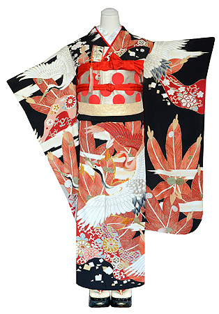 松の葉を背景に丹頂鶴が飛び交う大胆な図案の黒振袖。
