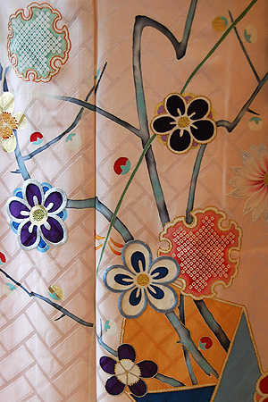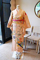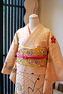 可愛らしい花熨斗文様の訪問着 アンティーク訪問着が入荷いたしました。 枝梅を包んだ花熨斗文様が上前に大胆に描かれた、レトロな趣のある訪問着です。 草花や花の枝を和紙で包み水引で飾った「花熨斗」。 室町時代には、七夕に宮中へ贈るしきたりがあったといいます。 雅な文様ながら可愛らしい印象を感じるのは、ころんと丸い梅の花のおかげでしょうか。 薄桃色の綸子地なのでお顔映りもよく、冬のご参列や華やかなパーティーなどにおすすめです。 枝梅花熨斗文綸子訪問着 レンタル一式 45,000円 冨永