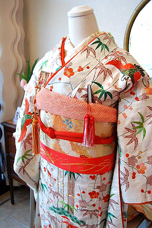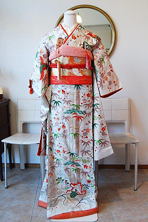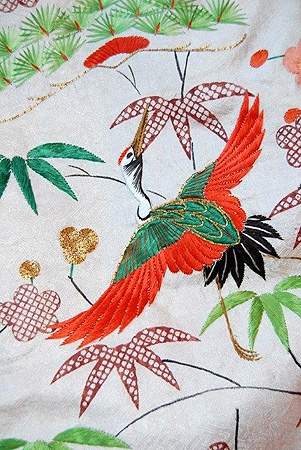 江戸期または明治初期に仕立てられた純白の綸子地に染と刺繍で松竹梅、飛び交う丹頂鶴がデザインされた婚礼衣装。