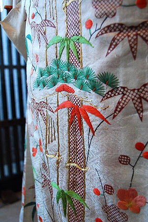 紅花染めの胴裏、細い絹糸で織り出された地模様が現代のものにはない独特な優美さを醸し出し、気の遠くなるような手刺繍の緻密さに心奪われます。