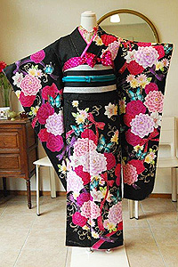 薔薇に蝶々文様黒振袖