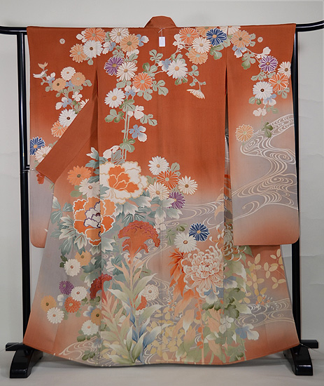 右外袖から後姿にかけて流れる観世水が花の間を縫い、着姿に優雅な変化をつけます。